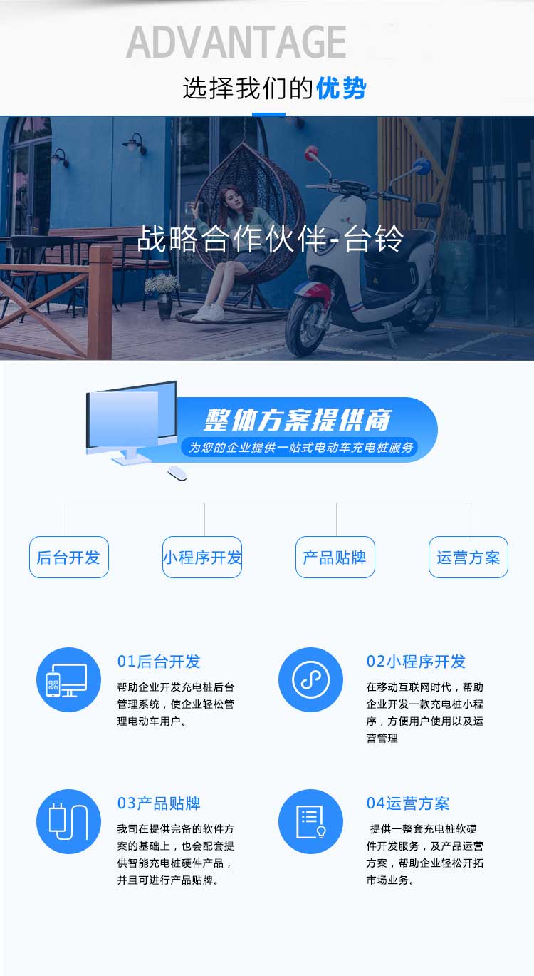 動車、智能充電樁、智能充電柜、電動車銷售與售后平臺,致力于打造一套完整的電動車生態(tài)圈,為客戶提供電動車從購買到使用、充換電及售后乖全方位的產品體驗。